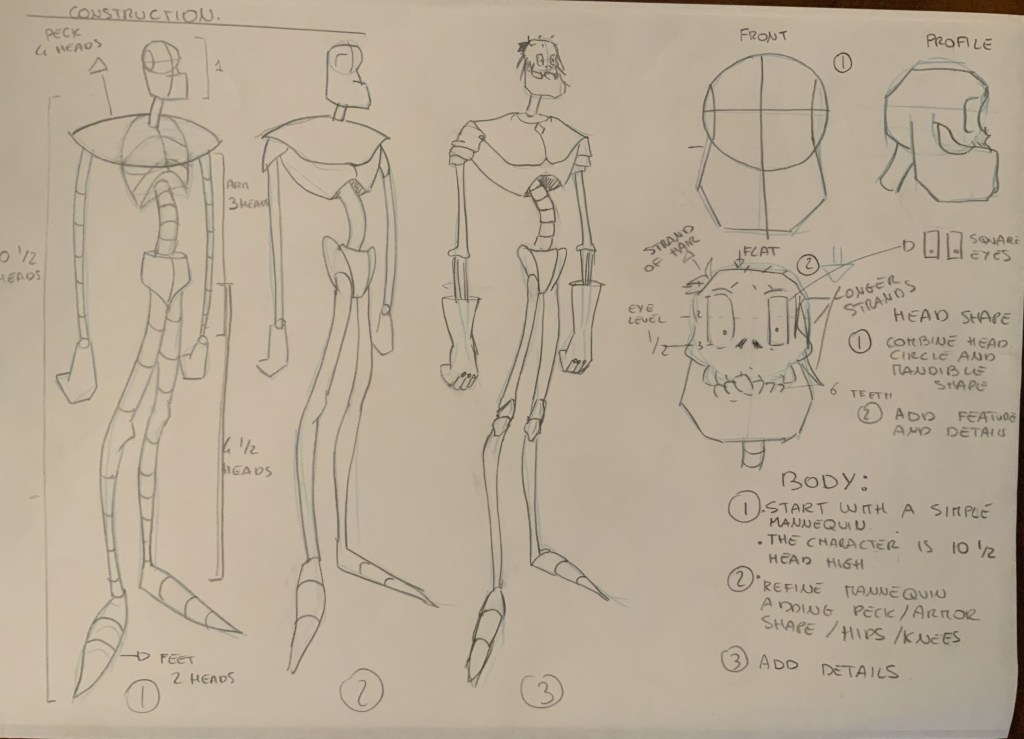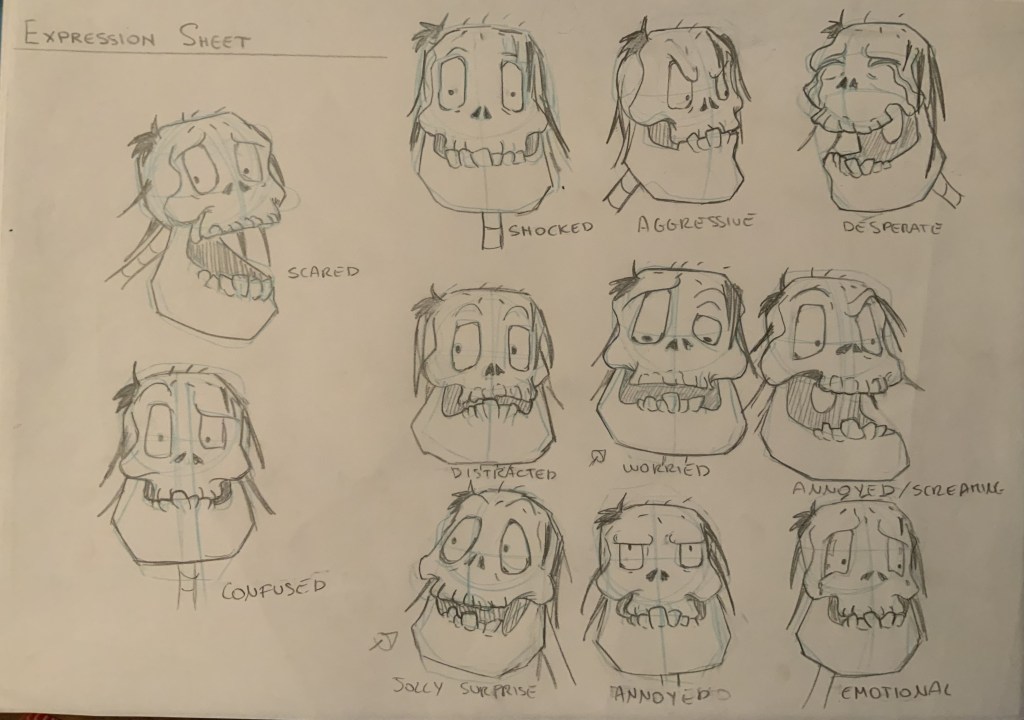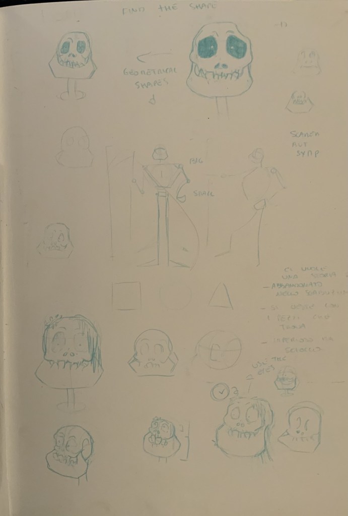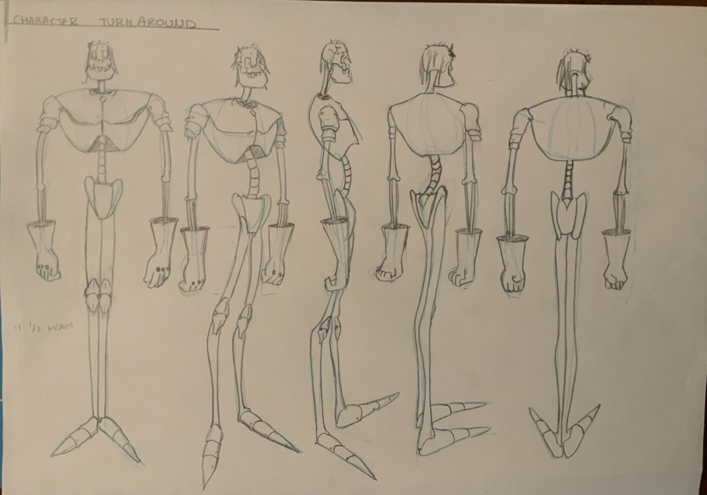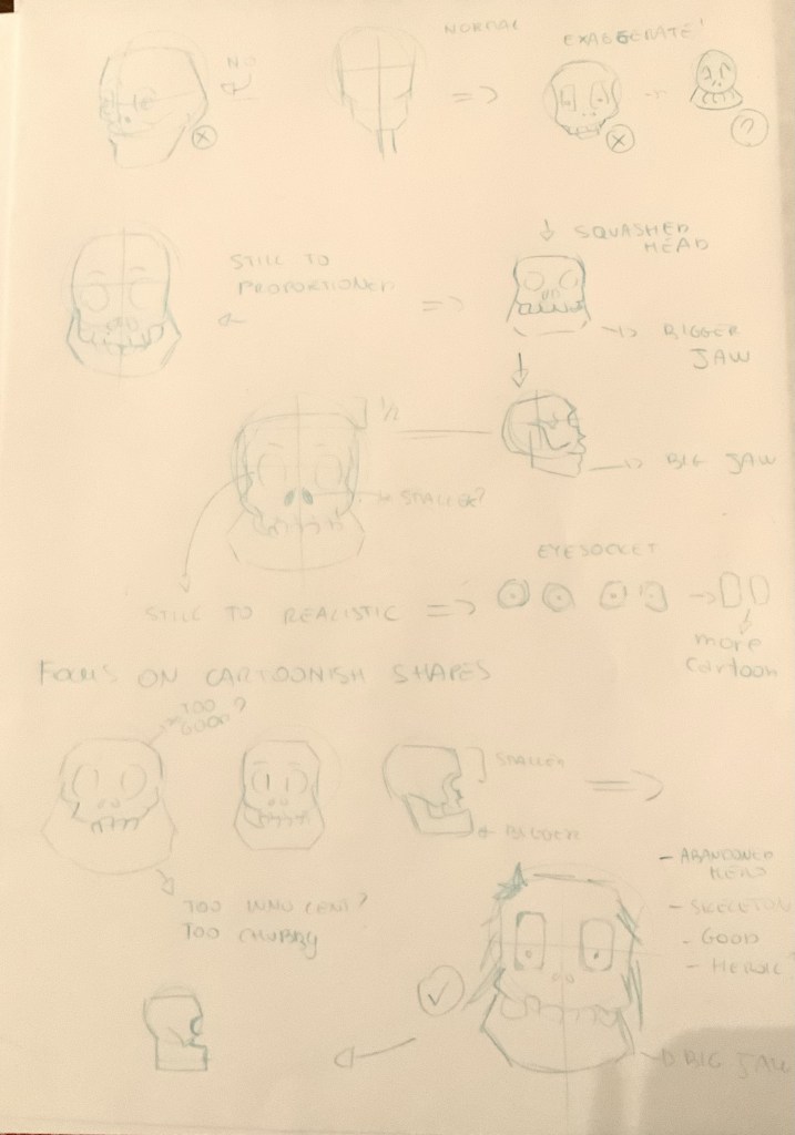 During this phase I started to realise I wanted to move towards a more cartoonish kind of style, something that could be a bit more vibrant , I didn’t want to follow realism as it seemed to be I would be too constricted with the lines. Absolute realism could have been an issue in trying and give some expressions to the character being it made of bones . I wanted to be able to move it easily.