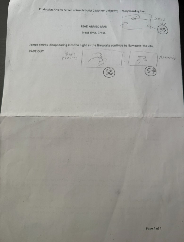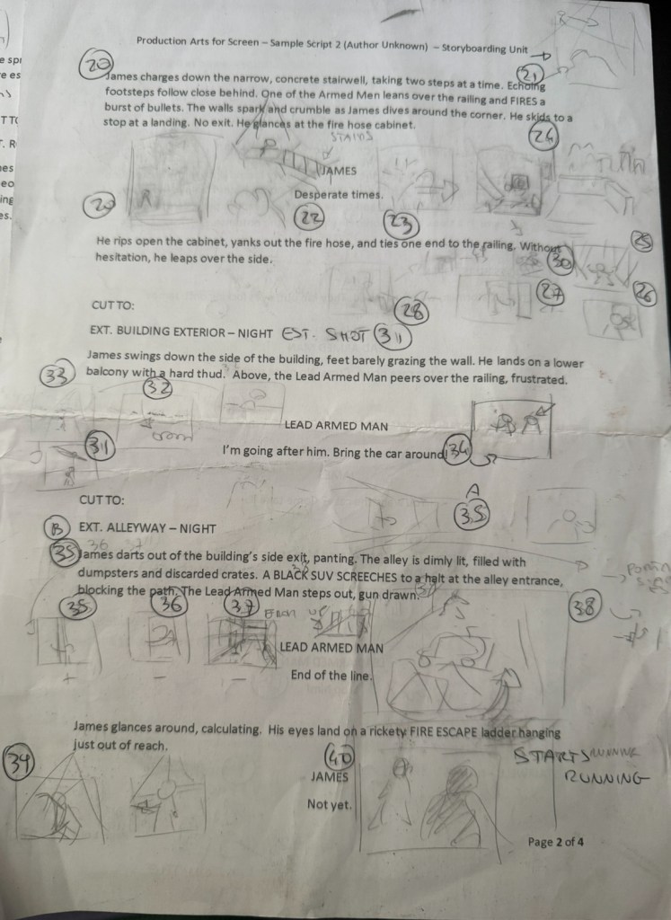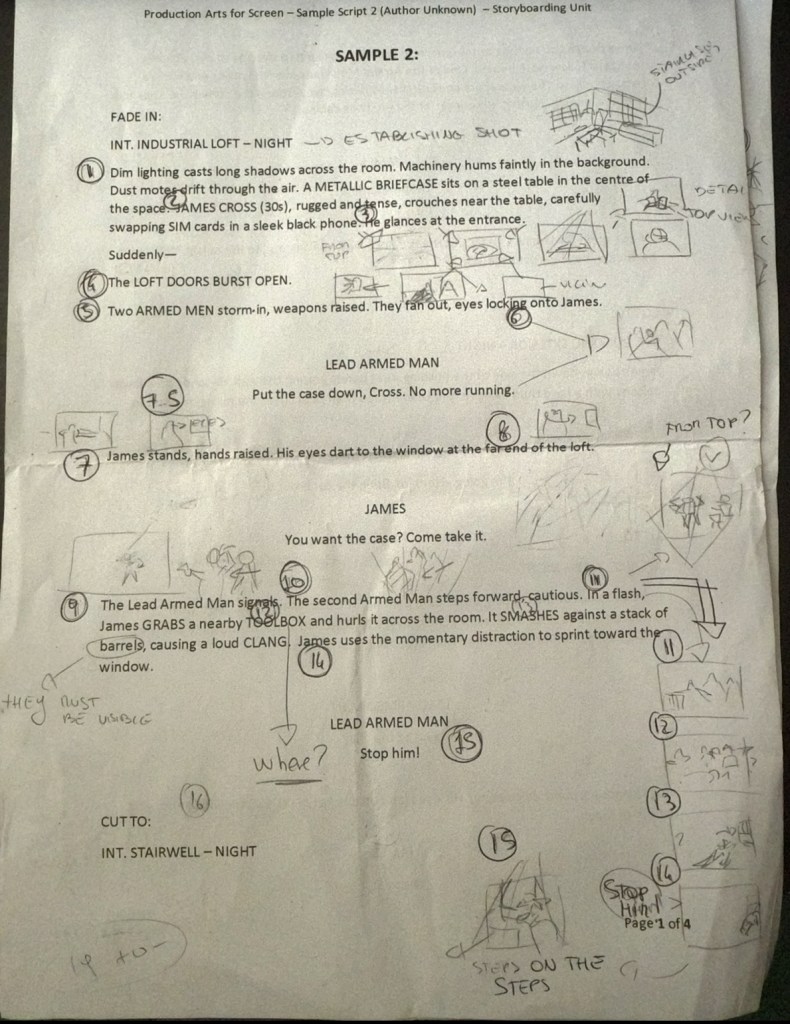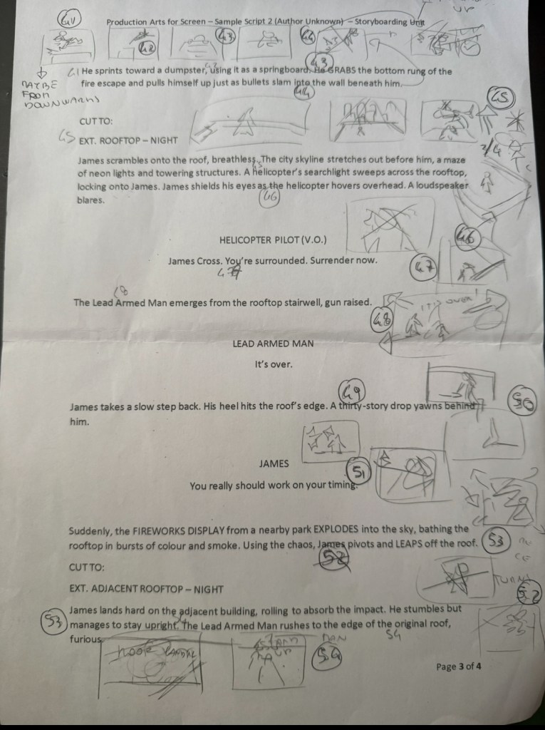 After deciding which script to focus on, I started my prep work. The first phase consists of reading the script accurately and putting down some notes on what is expected. Using numbers, I tried to identify the major scenes I would have to draw. For now, I have identified 57, but there are going to be more as I break down the script more in the thumbnailing phase and I start to see how the various panels fit together. Using simple squares, I did a sort of pre-thumbnail to start visualising a bit. They are very tricky to understand, and that is why I called them pre-thumbnails. When I needed I also wrote some notes on the side.