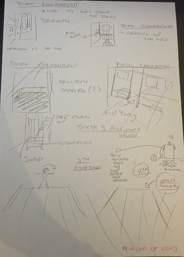 In order to make it clearer, I went through the script, taking notes with little schematics on characters’ movements and environments.