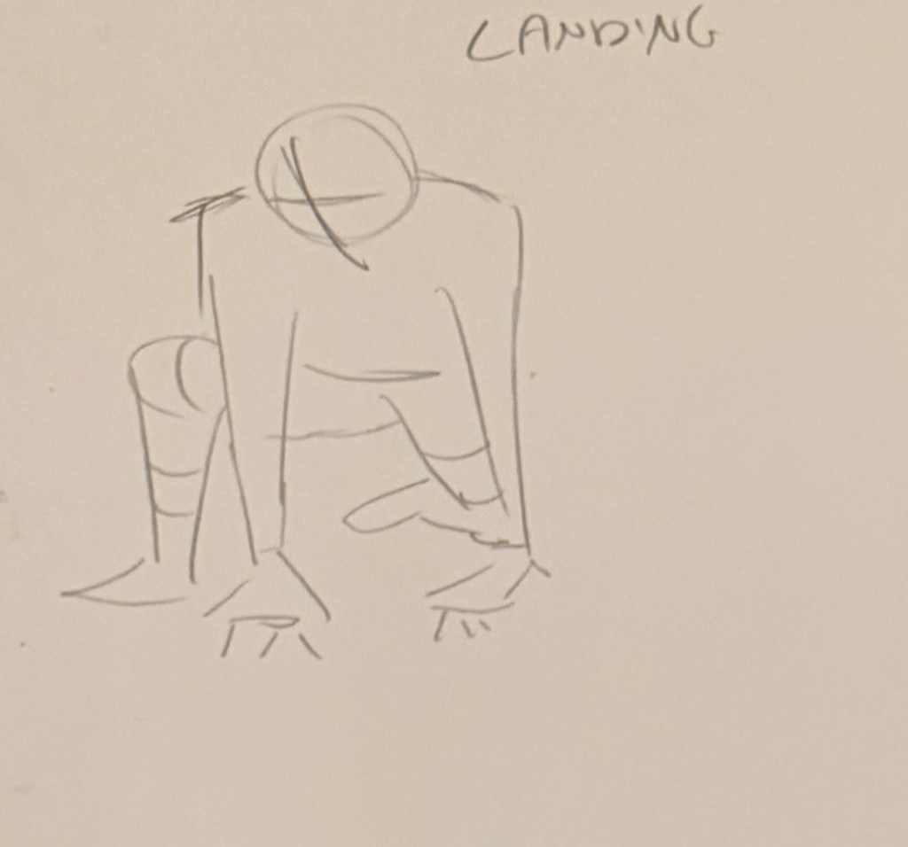 Since there are a lot of jumps and various landings, I thought that it could have been a good idea to take a look at some parkour videos and take some reference images in order to better understand which movement comes first when jumping and landing. In order to do that, I did a very simple drawing, trying to make the steps correlated.