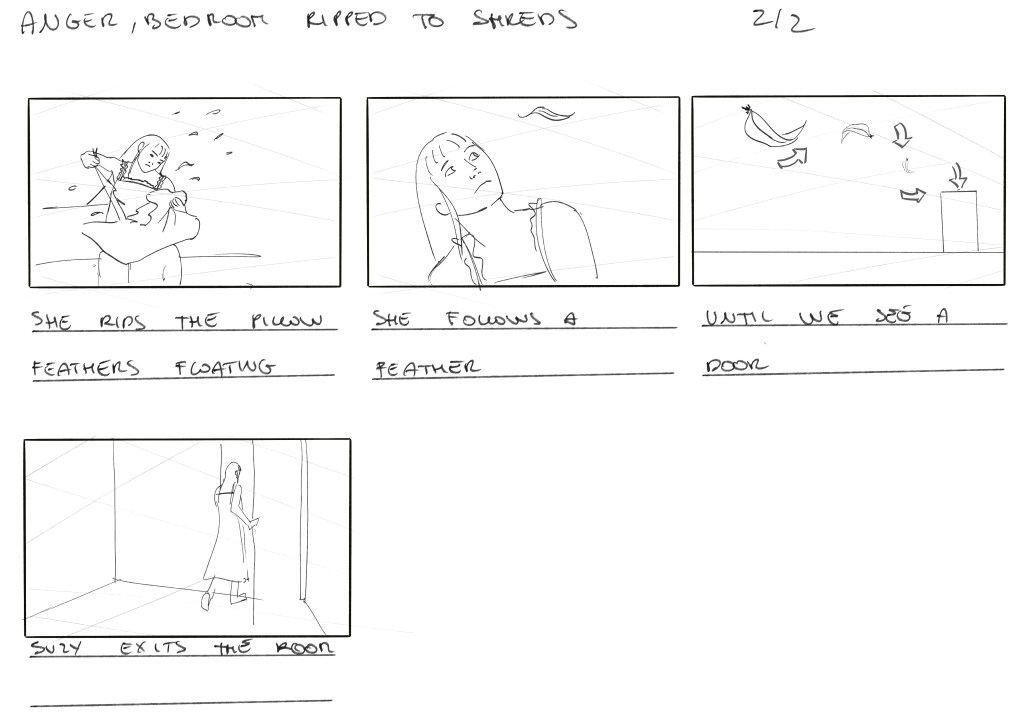 Getting onto Anger, the situation was a bit more complicated. In the scene, Suzie reminisces of her past. To me, while reading it, it seemed like almost a more “calm” scene. Like a pause after all the commotion of the other crazy rooms.