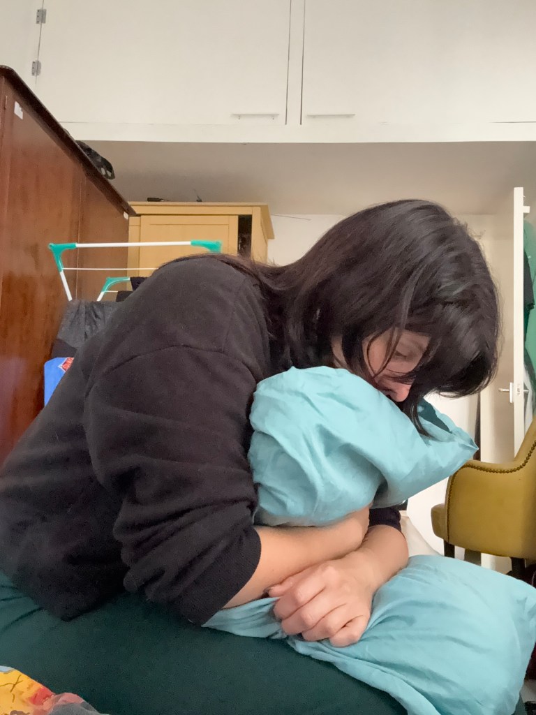 First when she sits down and is sad. I tried to hunch a little bit to communicate how i was grasping the pillow.