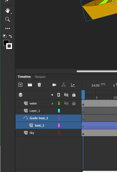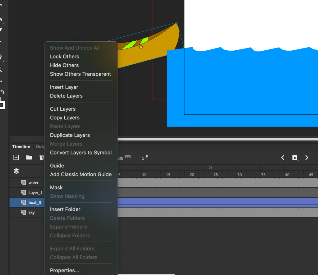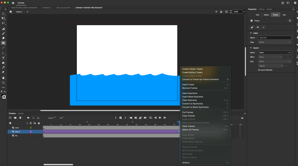 Let’s start by establishing keyframes at the beginning and the end of out animation, after that we righ click and establish a classic tween to make the boat move from left to right.