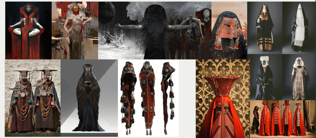 I will reimagine the Bride of Frankenstein as a design-driven exploration that embodies a dialogue between vernacular and ethnic design elements. The Bride’s visual identity will incorporate ethnic and traditional design references, such as textiles, markings, and material choices, to suggest an inherited, yet human, presence living beyond scientific intent or control. The project explores themes of creation without consent, autonomy (of the body and of the mind), fear of the irrational and abandonment. I will try to express this through a contrast between monumental, engineered environments where minimalism, scale, emptiness and rigid geometry can reflect restrained emotional suppression and authority, opposed to ethnic elements, which will not be used as a decoration but as an element of disruption of the rational order, humanity, instinct and emotional depth.